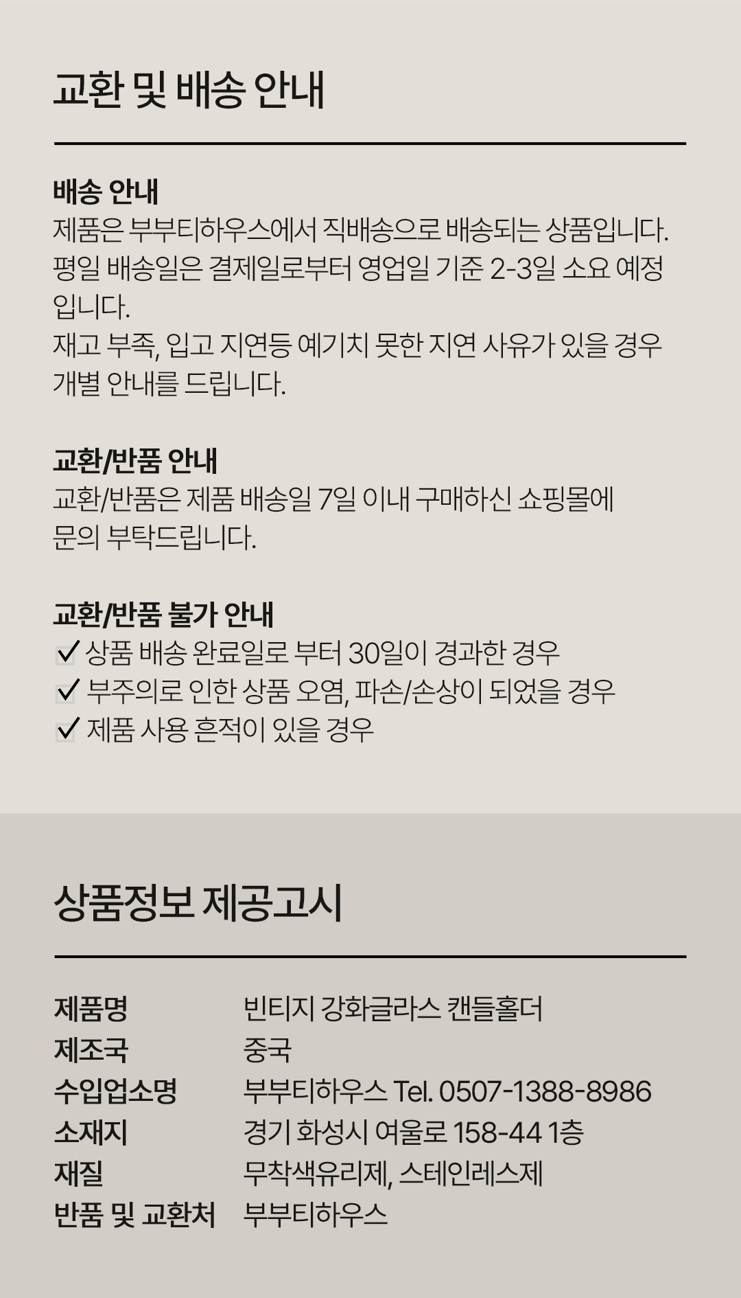 · 구매 후 7일 이내, 상품이 훼손되지 않았다면 교환 및 환불이 가능합니다. 다만, 이 경우 왕복 배송비를 부담하시게 되며 사용된 할인쿠폰은 반환되지 않습니다.