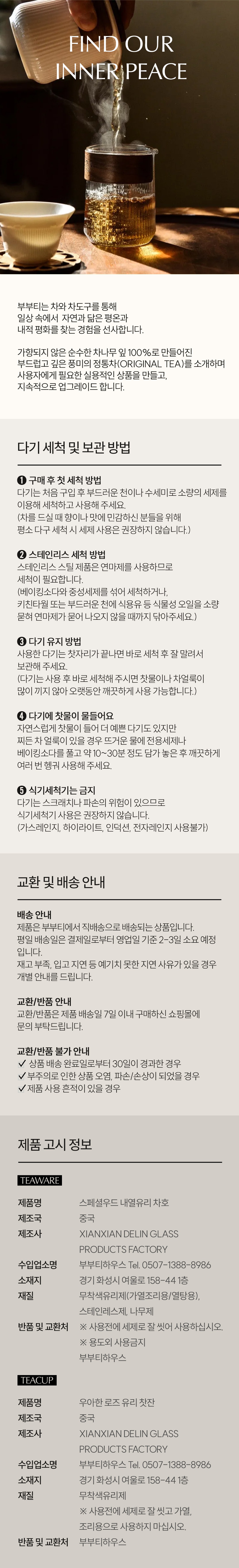 주식회사 부부티하우스 18421 경기 화성시 여울로 158-44 1층 부부티하우스 대표이사. 최형석 박지의사업자등록번호. 570-86-03077 [사업자정보확인] 통신판매신고. 제2024-화성동부-0599 이메일. bubuteahouse@gmail.com 대표번호. 0507-1388-8986